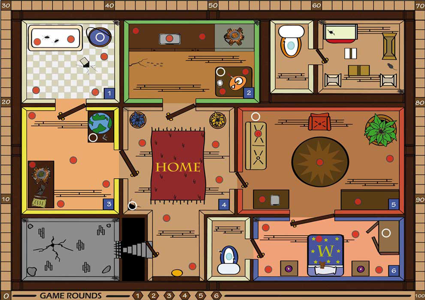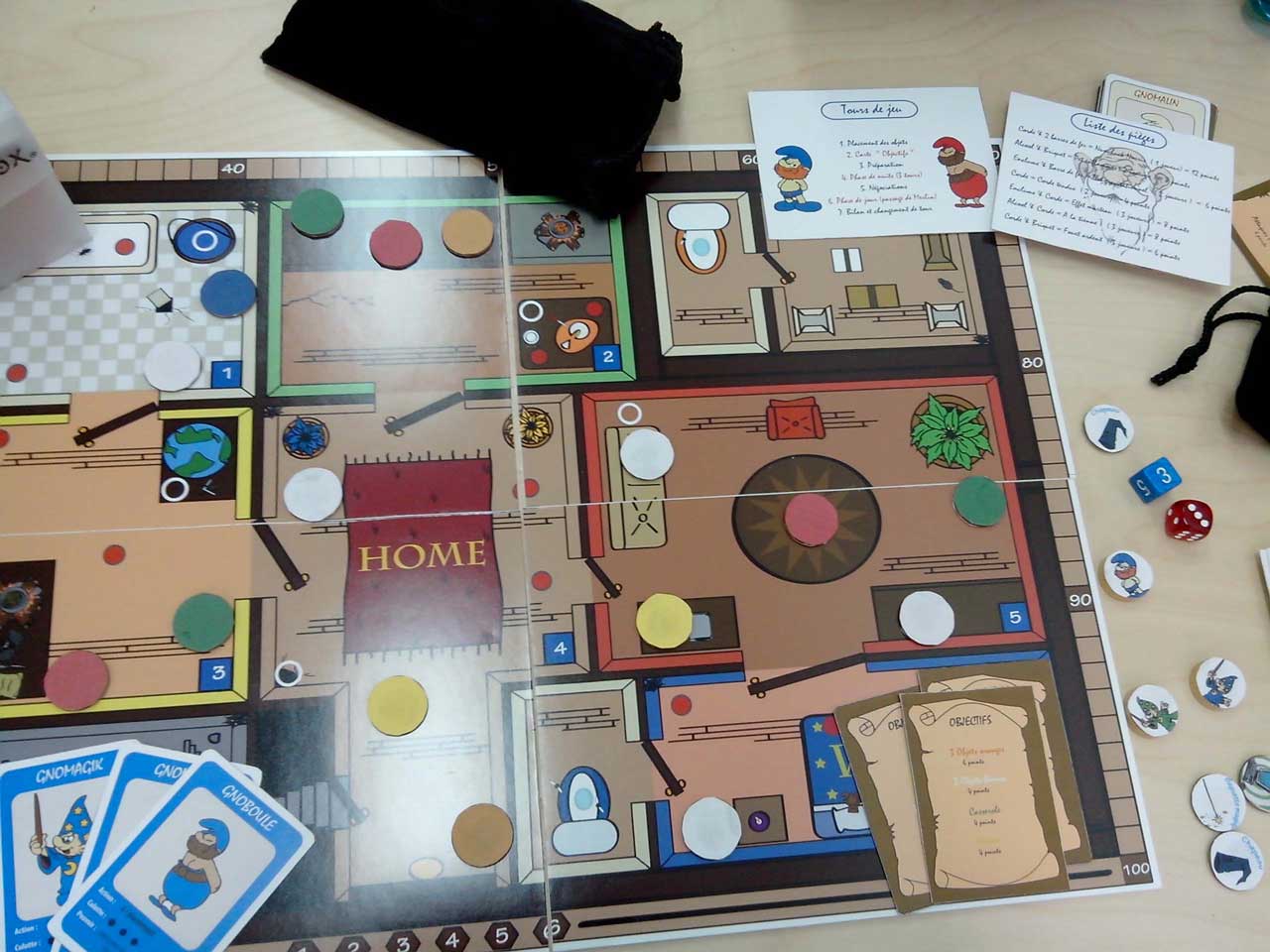In a Light Fantasy world, each player embodies a team leader of a gnome brotherhood and has to send his partners into the various rooms of Merlin’s house to steal items. The goal is to reach objectives stealing good items in order to score a lot of points.
